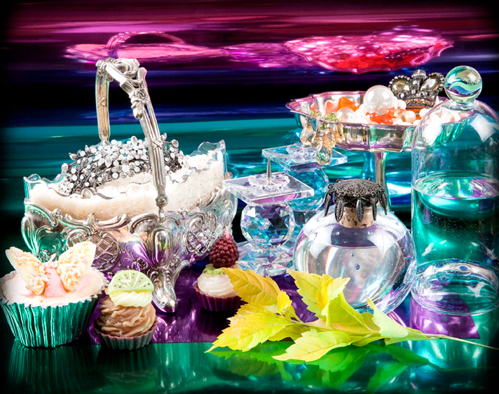 I collect, sort and arrange the items intuitively, guided by color, texture, shimmer and transparency. The result is a hybrid world where objects from different sources coexist. Just like in classic Dutch still life paintings, the objects in my photographs present the wealth of the trader/merchants class, who, through their trade collected objects from around the world. These compact treasures offered their collectors a taste of riches and luxury from other cultures. My work grounds such collections in a post-modern context, where the visual boundaries between valuable artifact and mass produced imitation begin to blur. The philosopher Walter Benjamin writes in “The Work of Art in the Age of Mechanical Reproduction"(1938) about the change in perception of art caused by the having so many copies of an image. Likewise, the industrial reproduction of decorative artistic objects changes the way we value these objects. Once objects “made in China” were rare and exotic to the west. In today’s post-colonial world, these cheap objects are industrial imitations of what was once hand made only by the most talented of craftsman. Dutch Painters were concerned with vanitas - the decay of beauty, however in these works beauty is not threatened by its decay but ironically is saved for prosperity by their artificiality. These images stretch the border between fine taste and commercial kitsch. Highly saturated and overly detailed, they are designed to stimulate the senses, almost giving the impression that they are not only a visual spectacle, but a multi- sensual one.